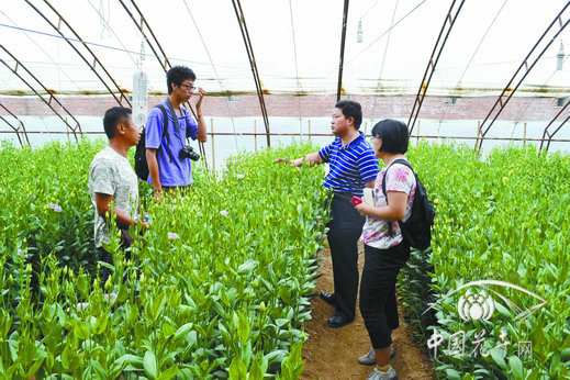 近年来洋桔梗在婚庆市场的需求与日俱增,北京周边区县也开始种植洋桔梗供应主城区。目前供应北京市场的自然花期的洋桔梗已经开始出花,其价格比之前也有所回升,达到每扎30元左右。图为北京周边洋桔梗种植户与代理商讨论洋桔梗的长势。