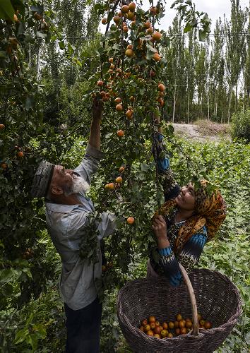 7月1日,新疆喀什地区疏勒县塔孜洪乡农民在采摘鲜杏。