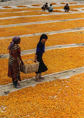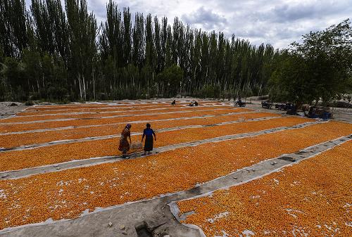 7月1日,新疆喀什地区疏勒县塔孜洪乡农民在晾晒杏干。