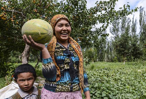 7月1日,新疆喀什地区疏勒县塔孜洪乡农民茹仙古丽在自家瓜田边笑逐颜开。