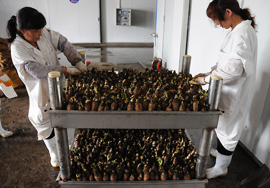 6月30日,在河北省滦平县周台子村一菊苣厂,工人在整理菊苣根。