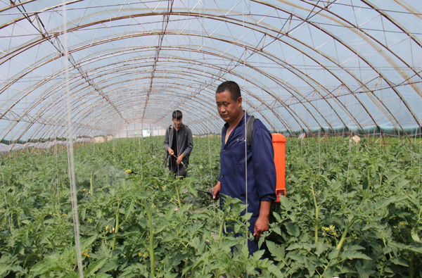 6月27日上午,牡丹江市阳明区千亩有机蔬菜生产基地的农户正在对西红柿进行科学管护。