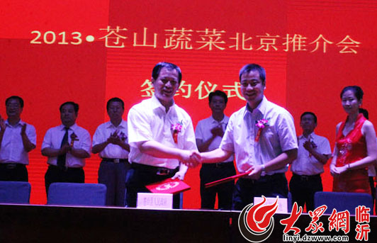 苍山县人民政府和北京新发地农产品市场签约,将优质、安全、健康的苍山菜能够尽快进入北京市场。