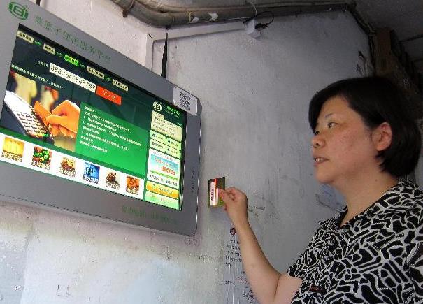 7月3日,北京市东城区和平里兴化社区的居民通过住宅楼内的“181”菜篮子便民服务平台终端选购蔬菜并刷卡支付。