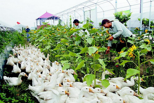 近年来,汉台区深挖农村农业资源,延伸农业产业链,引导农民发展特色种植业与养殖业,促进了农民增收。图为铺镇万亩蔬菜基地,农民正在葵花园里发展家禽养殖业。