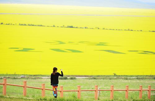 7月9日,一名游客在青海省门源县油菜花田的观花台上拍照。