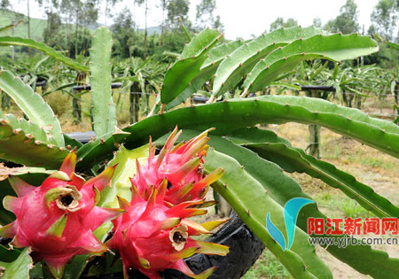 一种高效益经济作物――名为“台湾玫瑰红”的红心火龙果,目前在阳江市阳东县大八镇周亨村委会清湾自然村“开花结果”,今年6月份起试产上市。昨日,记者慕名前往探访这一无公害食品生产基地。