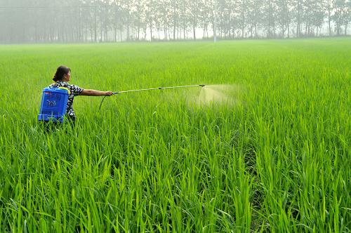 7月13日清晨,江苏省徐州市睢宁县常青村农民在水稻田里喷药防治病虫。