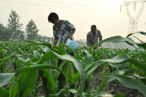 7月13日清晨,江苏省徐州市睢宁县王小楼村农民在田地里施肥。