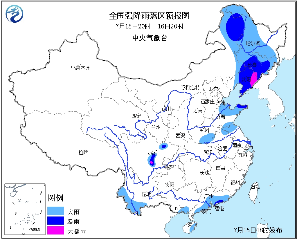 预计15日20时至16日20时,内蒙古东部、东北地区大部、黄淮东部和南部、四川盆地西部、云南南部及华南南部等地的部分地区有大雨或暴雨,其中,辽宁东部、吉林东南部、四川盆地西南部等地的局部地区有大暴雨(100~150毫米)。