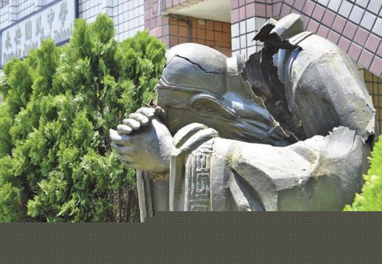 中国台湾网7月16日消息 台湾桃园县新屋乡永安初中不敌“苏力”侵袭,校舍屋顶的60米长铁皮遭强风吹掀,掉落时宛若“血滴子”横扫校园,硬生生将十几米高的树干从中剖半,更“斩首”孔子雕像,头颅恰好滚落雕像手上,形成诡异景象。这尊手捧头颅的“无头孔子”,有人认为是不祥象征,有人则认为纯属巧合。