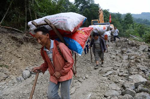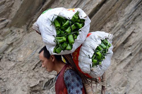 7月17日,四川绵阳北川县坝底乡青坪村村民在转运青椒。