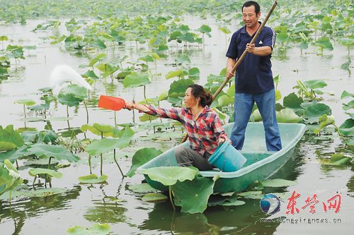 7月17日,山东垦利县黄河口镇莲藕种植大户刘美利夫妇正在给莲藕施肥。