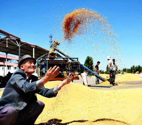 7月16日,伊宁县曲鲁乡赛依买里村村民阿不都克力木看着来之不易的丰收成果,激动得用手扬起了麦子。伊宁县今年可谓是风调雨顺、天道酬勤,全县291397亩小麦丰收,预计可产小麦116532吨,平均单产405公斤。