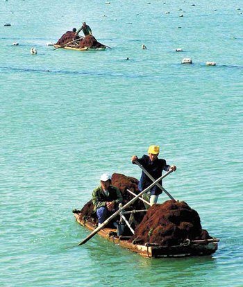 记者在青岛聚大洋公司海上养殖基地里看到龙须菜是如何采摘的,工人师傅们开着小船到海上,再将收获的龙须菜运到码头。在码头上,另一批工人师傅对收获的龙须菜进行简单的处理后,装车运往公司,进行晾晒、烘干。据悉,龙须菜是一种高膳食纤维、高蛋白质、低脂肪,富含维生素和矿物质的海藻食品,在我国南方有普遍种植。这次试养成功,也标志西海岸地区的海域环境可以满足龙须菜的生长要求。工作人员告诉记者,这次龙须菜的收获非常好,初次试养2000亩 ,产量还不错,每亩能出干品1吨。