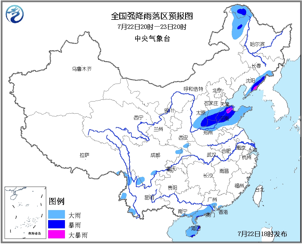 中央气象台7月22日18时继续发布暴雨蓝色预警: