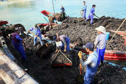 每年7、8月是浙江舟山群岛最北部的海岛县――嵊泗县的贻贝丰收季,养殖户们迎来一年中最忙碌的时节。贻贝俗称淡菜,是一种具有较高营养价值的贝壳类海鲜食品。2012年嵊泗县海上贻贝养殖面积超过2万亩,产值超过1亿元,是名副其实的海上牧场,贻贝养殖已成为当地百姓主要的经济来源。