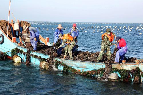 7月23日,浙江省嵊泗县嵊山边防派出所官兵在海上养殖基地帮助渔民收获贻贝。新华社记者 徐昱 摄