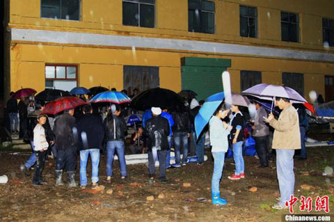 甘肃蒲麻镇设置的帐篷分配点,因数量有限,只能优先照顾受灾严重者以及老弱病残者。24日傍晚开始,一场大雨降临,村民们度过了艰难的一夜。图为蒲麻镇临时帐篷发放点门前,聚集了许多等待领取帐篷的井滩村民众。胡贵龙 摄