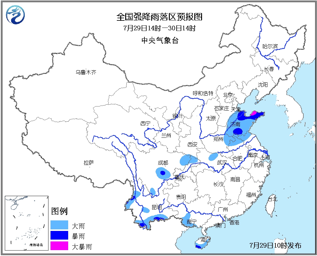 中央气象台7月29日10时继续发布暴雨蓝色预警: