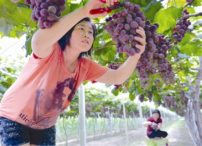 7月26日,宿州市?桥区大营镇众生园专业合作社社员在采摘葡萄。近年来,该镇引导群众结合当地地形和气候情况,发展葡萄等特色种植,取得了良好的经济效益。目前,通过大棚避雨栽培技术培育的3000余亩优质葡萄已进入成熟季节,每天吸引大批外地客商前来采购。