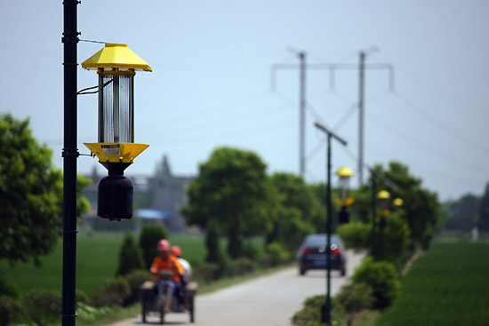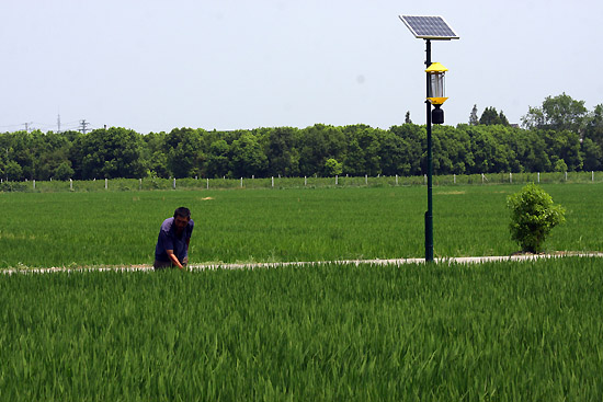 近日,江苏省无锡市锡山区羊尖镇严家桥村的千亩水稻园相继安装上新引进的频振式太阳能杀虫灯。此种杀虫灯将太阳能转化为电能,利用昆虫的趋光、趋波、趋色等特性诱杀田间害虫,绿色环保、不需使用药物,每个杀虫灯有效作用面积为8至10亩。 新华社发(朱吉鹏 摄)