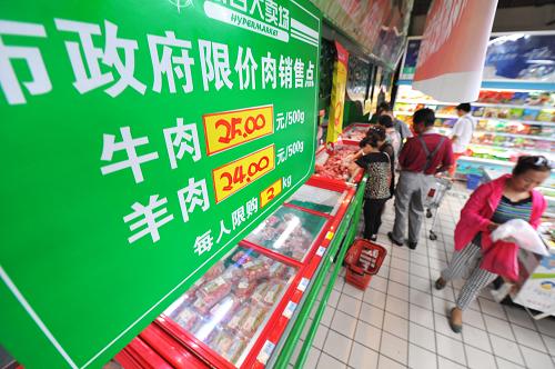 8月6日,在宁夏回族自治区银川市一家大型超市内,限价牛羊肉的销售价格低于市场平均价格每公斤6元左右。新华社记者 彭昭之 摄
