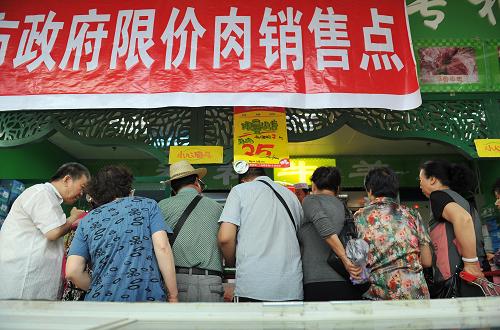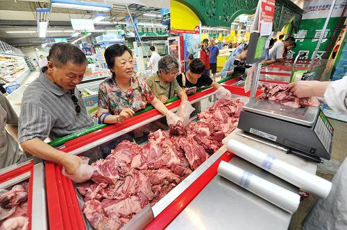 8月6日,在宁夏回族自治区银川市一家大型超市内,市民在选购政府投放的限价牛羊肉。新华社记者彭昭之摄