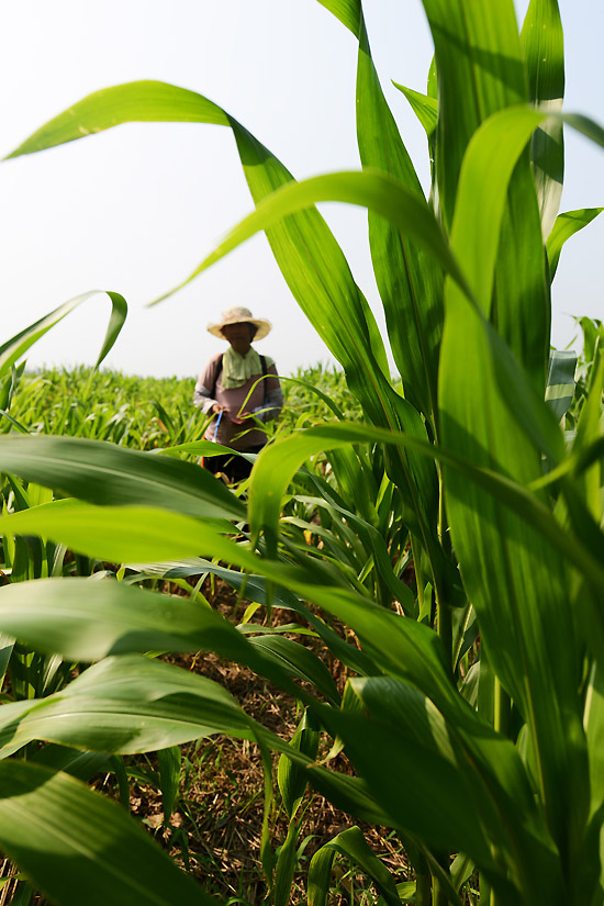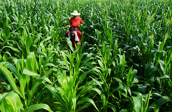 8月6日,山东省邹平县台子镇张石辛村农民在玉米地追肥。