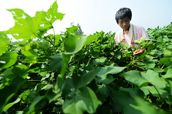 8月6日,山东省邹平县台子镇大赵村农民张月娥在照看地里的棉花。