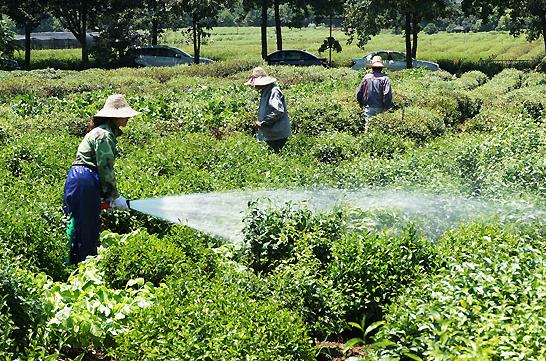 8月6日,杭州双峰村的茶农正在为龙井茶园浇水。