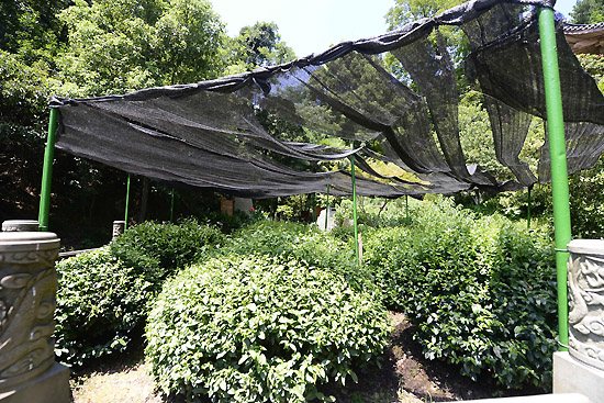 8月6日,茶农为杭州龙井村的“十八棵御茶”撑起防晒黑纱遮阳。