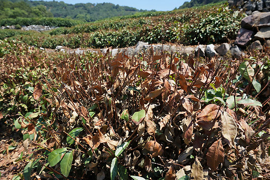 8月6日,在杭州龙井村的茶园里,部分龙井茶树因高温而枯死。