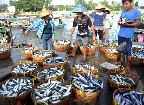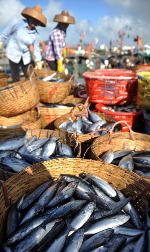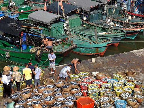 8月11日,在海南琼海市潭门港,渔民在码头装卸鱼货。新华社发(蒙钟德 摄)
