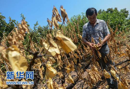8月7日,奉化市水蜜桃种植大户杨金宝查看因近期持续高温晴热而枯死的一株桃树。当日“立秋”,也是浙江省有气象记录以来高温强度最“彪悍”的一天。据浙江省气象台监测,至16时,全省有45个县(市、区)最高气温达40℃以上,27个县(市、区)达41℃以上,5个县、市超过42℃。其中奉化市最高气温达43.5℃,刷新了保持10年之久的全省最高气温纪录(原纪录为2003年丽水的43.2℃)。新华社记者 韩传号 摄