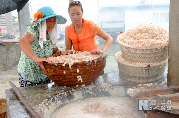 8月11日,连云港市连岛渔村渔民忙着将刚捕捞上来的毛虾清洗后加工制作虾皮。