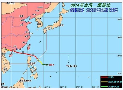 强台风“黑格比”于2008年9月19日夜间在菲律宾以东的西太平洋洋面上生成,22日下午2时加强为强台风,24日6时45分在我国广东省茂名市电白县陈村镇沿海地区登陆。登陆后继续向西偏北方向移动,向两广交界处靠近,强度逐渐减弱成低压。