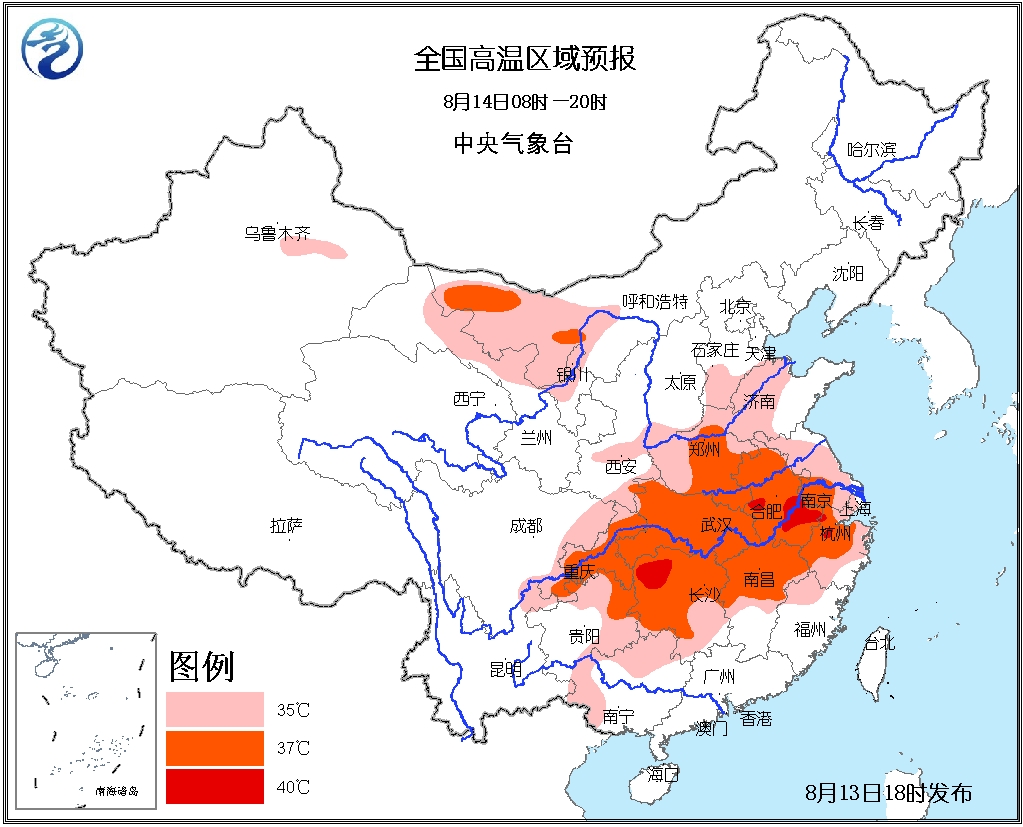预计明天白天,江南西部和北部、江淮、江汉、贵州东部、广西北部和西部、四川东部、重庆、黄淮中西部、华北南部及甘肃中部、内蒙古西部、宁夏北部、新疆吐鲁番盆地等地有35℃以上的高温天气;其中,黄淮中部、江淮大部、江汉大部、江南北部、重庆中东部、贵州东北部、内蒙古西部等地的部分地区最高气温有37~39℃,安徽南部、湖南西北部、浙江北部等地的部分地区最高气温可达40~41℃。