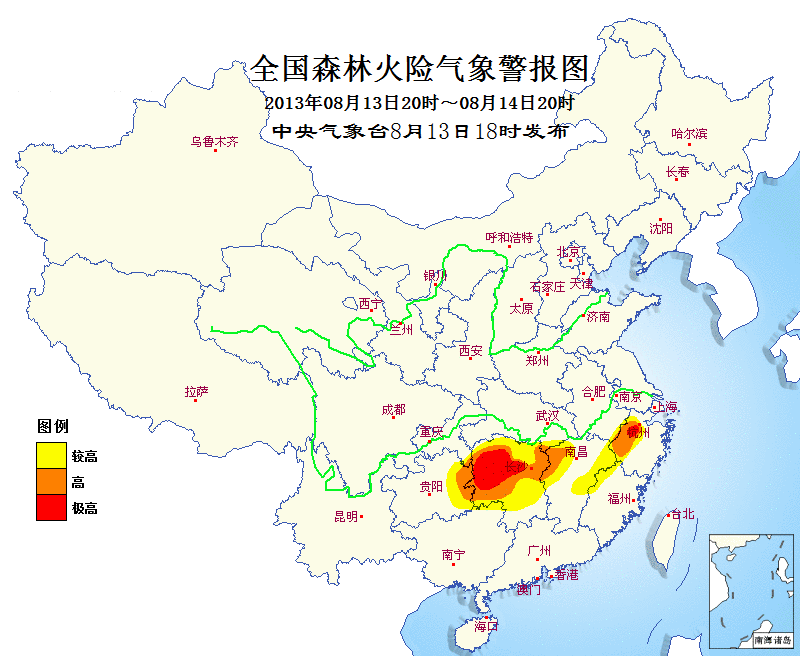 预计,2013年8月13日20时至8月14日20时,重庆东南部、贵州东部、广西东北部、湖北东南部、湖南大部、江西中北部、安徽东南部、浙江西北部、福建西北部等地的森林火险气象等级较高,其中,重庆东南部、贵州东部、湖南大部、江西西北部、浙江西北部等地的部分地区森林火险气象等级高,湖南中西部、浙江西北部的局部地区森林火险等级极高,请各有关单位严加防范,严禁一切林内用火,确保林区安全。
