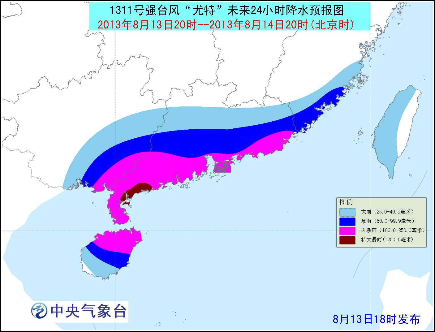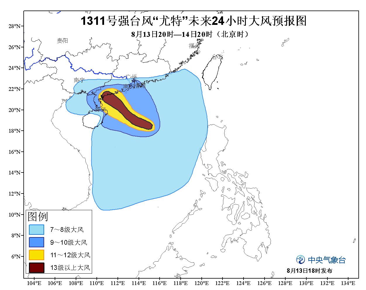 受“尤特”和西南季风的共同影响,13日20时~14日20时,南海中部和北部、琼州海峡、北部湾、广东西南部及广东沿海、海南北部和东部及其沿海、广西东南部及其沿海将有7~9级大风,部分海域或地区风力可达10~12级,“尤特”中心经过的附近海面或地区风力有13~15级,阵风可达16~17级;广东大部、海南、广西东南部、福建东南部、台湾大部等地有大雨或暴雨,其中,广东西南部和沿海地区、海南北部、广西东南部等地的部分地区有大暴雨,局部有特大暴雨(250~300毫米)。