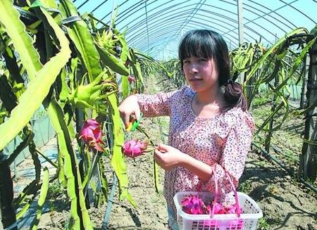 昨天上午,苏州名夫果园的首批红肉火龙果成熟采摘。果园工作人员介绍,红肉火龙果一般是在8~10月份成熟,红肉火龙果因营养价值较高,具祛脂降压,降低胆固醇等功效,所以颇受欢迎,首批红肉火龙果还未被摘下就被预订一空。