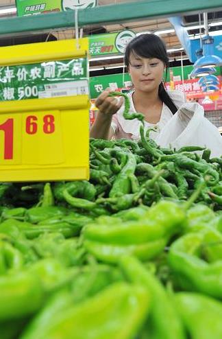 8月13日,在宁夏银川一家大型超市内,消费者正在选购蔬菜。