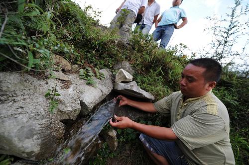 8月15日,贵州省黔南州惠水县鸭绒镇水冲村,村民在一处水源点取水。