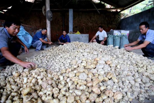 贵州榕江县忠诚镇盘踅村白玉百合加工厂村民在给百合分类。