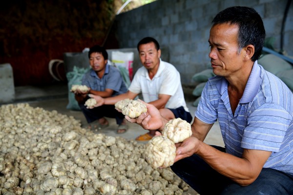 贵州省榕江县忠诚镇盘踅村村民展示丰收的百合。