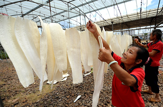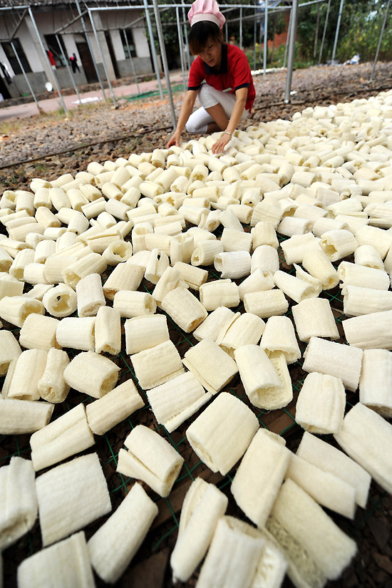 江西东乡县美尔丝瓜络有限公司员工在晾晒丝瓜络(8月15日摄)。