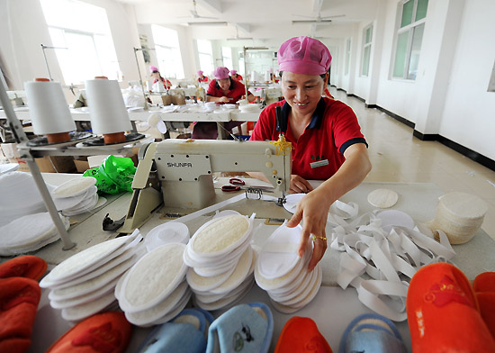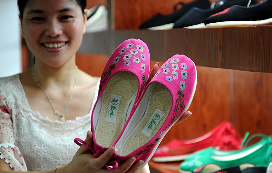 江西东乡县美尔丝瓜络有限公司员工展示用丝瓜络制作的布鞋(8月15日摄)。