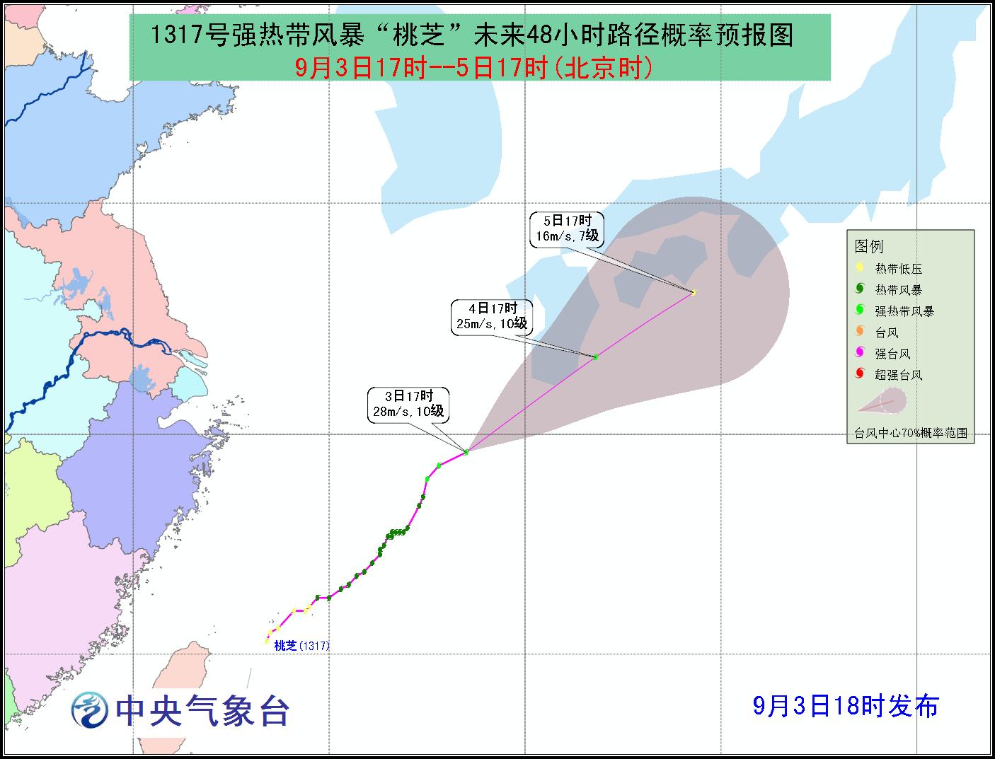 今年第17号热带风暴“桃芝”的中心3日17时位于日本鹿儿岛西南方约290公里的东海东部海面上,就是北纬29.6度,东经128.5度,中心附近最大风力有10级(28米/秒),中心最低气压为980百帕,七级风圈半径200公里,十级风圈半径30公里。