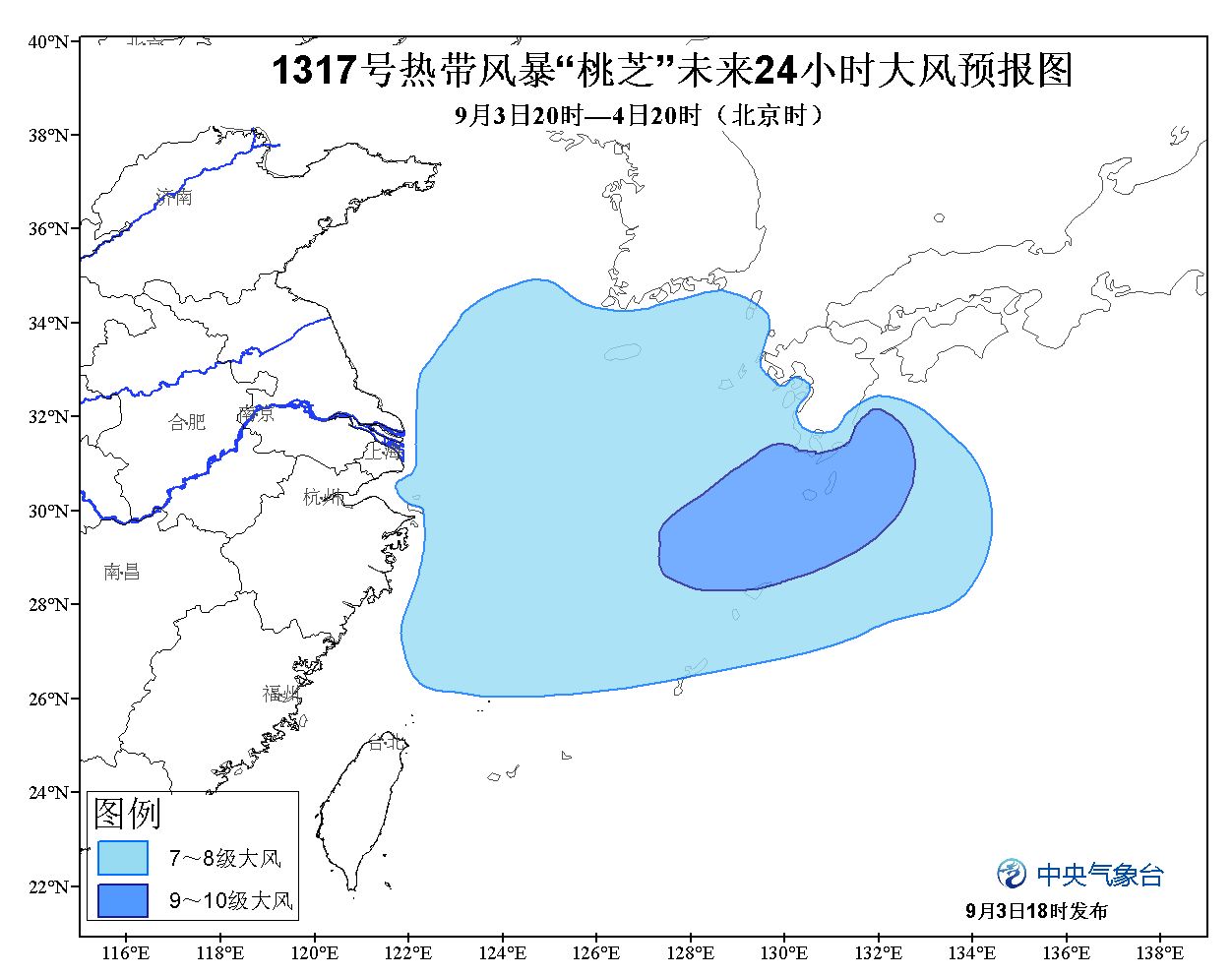受“桃芝”和南下冷空气的共同影响,3日20时到4日20时,东海大部、黄海东南部、长江口区、杭州湾、浙江舟山及附近沿海将有7-8级大风,“桃芝”中心经过的附近海域风力有9-10级,部分海域阵风可达11-12级。