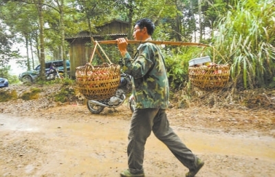 傍晚,村民在山上忙碌一天后,挑着两筐满满的红菇下山。